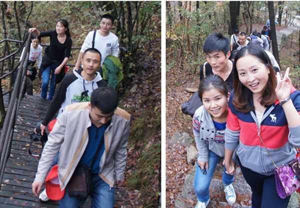 榮事達(dá)全體隊(duì)員不為艱難,奮勇而上,沒(méi)有一個(gè)人退縮亦無(wú)任何人掉隊(duì)。隊(duì)員們相互鼓勵(lì),相互照應(yīng),遇到極其陡峭或較滑的路段,前面隊(duì)員總會(huì)大聲招呼后面隊(duì)友小心注意;在極難攀爬的上坡處,總有隊(duì)友伸出援手拉一把。經(jīng)過(guò)兩個(gè)多小時(shí)的艱難跋涉,所有隊(duì)員都成功登頂。