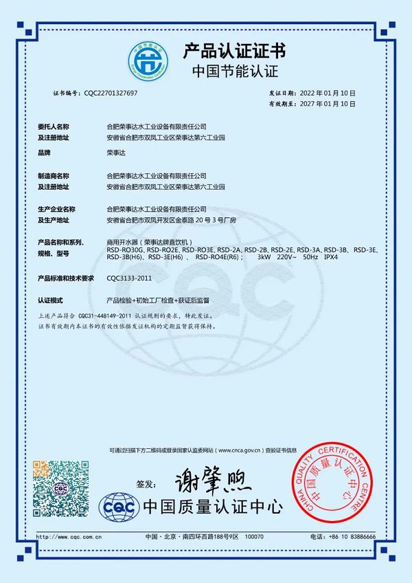 榮事達RSD-RO4E節能直飲機是中國節能認證產品,產品采用節能熱交換技術,在管式交換器內,過濾后的自來水吸收開水釋放的熱能升溫85℃左右,從而充分節省了降水燒開所需的電能和時間,有效改善了傳統飲水機的費時、費電的弱點。設備采用二開水二溫水設計,既滿足了員工泡茶的需求,也提供了即飲的溫水選項,極大地方便了員工的日常飲水。此外,設備采用先進的RO反滲透技術,有效濾除水中的泥沙、鐵銹、重金屬等雜質,出水可達直飲標準。